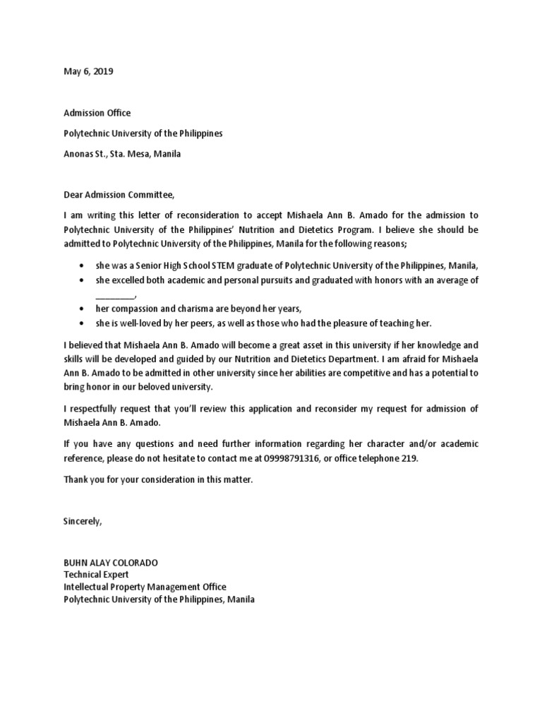 School Admission Sample Letter Of Appeal For Reconsideration On Admissions from imgv2-2-f.scribdassets.com Over 100k legal forms · bbb a+ rated business Free information and preview, prepared forms for you, trusted by legal professionals Feb 21, 2013 · address the recipient in a formal manner. Jan 17, 2019 · college's address. Can i write a reconsideration letter to the jud? Download or email hf0315x019 & more fillable forms, register and subscribe now! My application was declined on date, and the reason given was that my sat scores were lower than what is required by the college for admission. Oct 25, 2018 · avoid expressing your hardships or devastation.